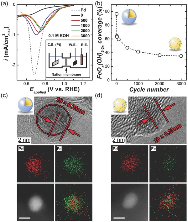 (b)不同循环圈数后的Pd/FeOx(OH)2−2x纳米颗粒的表面FeOx(OH)2−2x的覆盖率;
