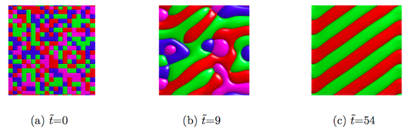 共晶合金自然固化成两相复合材料,可用于许多工程领域,特别是高强度材料。在结晶过程中,不同化学成分的两相通过与生长前沿相邻的液体区域进行扩散交换溶质。这两个阶段的几何排列是由一个模式形成过程产生的,而该过程是由扩散和毛细现象的相互作用所支配的。不少研究已经解释了这种耦合增长模式的诸多特征。如果两个固相的体积分数是可比较的,则它们在交替的薄片中自组织;否则,少数相的棒分散在另一相的连续矩阵中。在许多实验和数值模拟中也研究了表现出更复杂的对称性或无序的结构。