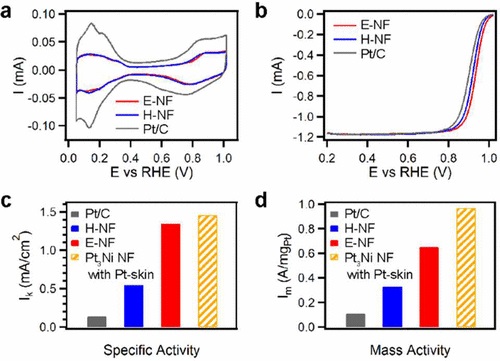 (c)电压为95 V vs RHE时,Pt/C, H-NF, E-NF以及带Pt表层的Pt3Ni NF的比催化活性对比图;