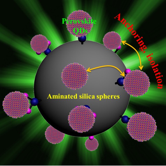 近日,针对全无机钙钛矿光稳定性这一关键问题,南京理工大学新型显示材料与器件工信部重点实验室曾海波教授和新加坡南洋理工大学孙汉东教授合作,在Adv. Mater.上发表了题为“Amino-Mediated Anchoring Perovskite Quantum Dots for Stable and Low-Threshold Random Lasing”的文章,报道了将钙钛矿量子点钉扎于单分散硅球表面的新思路,既可实现低阈值随机激射,又可大幅度提高在强光照射下的激射稳定性。其中,南京理工大学李晓明博士和南洋理工大学王跃博士为本文的共同第一作者。