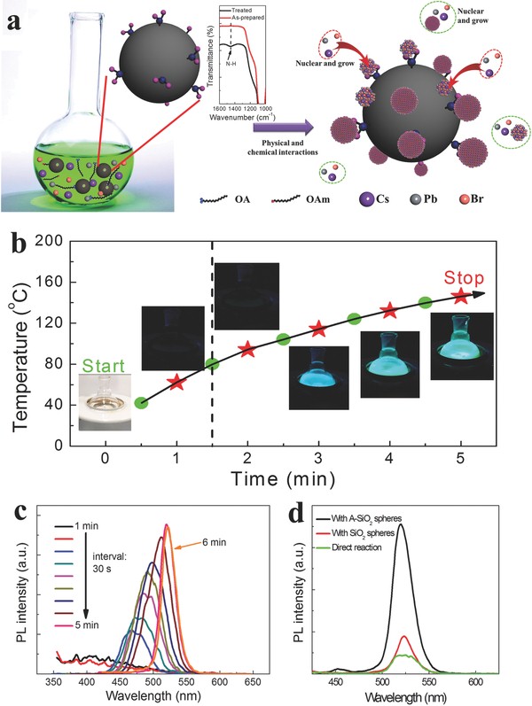 (b), (c) 合成过程中溶液温度、颜色变化即荧光光谱的原位监测