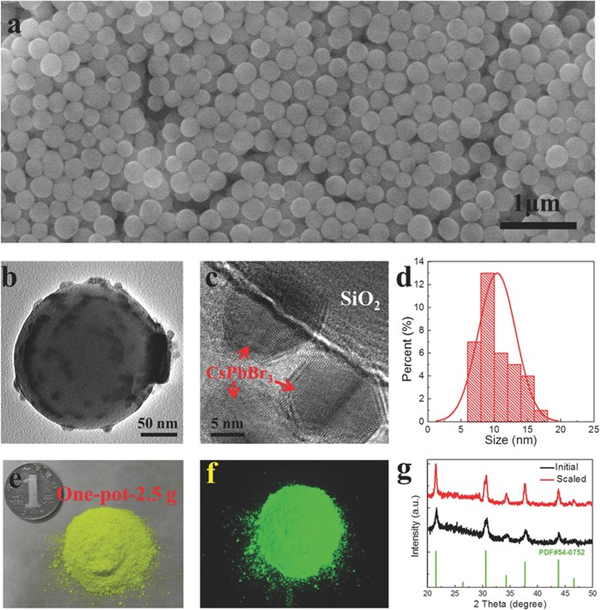 在该文章中,作者通过结构上的创新,将钙钛矿量子点钉扎在二氧化硅表面并调控量子点之间、硅球之间的间距,有效地抑制了强光效应诱导的荧光衰减和晶体变化,从而大大提高了钙钛矿量子点的光稳定性。通过二氧化硅/钙钛矿量子点光子玻璃系统的构筑,实现了高效稳定的随机激光发射。此外,他们还首次报道了一种钙钛矿量子点复合荧光粉的一步合成策略,该方法简便、快速且具有普适性。该工作为钙钛矿量子点的实际应用奠定了良好的理论和实验基础,也为基于钙钛矿量子点的多功能复合体系的构筑提供了参考。