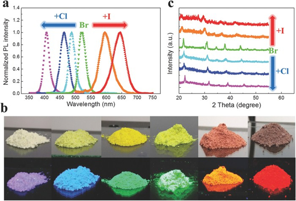 相对于优异的光学性能,其光、热、水、氧稳定性却是急需提高的短板,成为该体系走向高清柔性显示的关键问题之一。最近,研究人员已经发展了表面氯掺杂、低通量X射线辐射、介孔氧化硅或有机包覆等方法,大幅度提高了CsPbX3 QDs的湿度与空气稳定性。但是,在实际应用中,水汽与氧气可以通过成熟的封装工艺进行隔绝,而热及光辐照却很难避免,当前该体系量子点的热及光辐照稳定性仍然进展不大。更为关键的是,在QLED等光电器件中,量子点的表面状态对电荷注入与输运尤为关键。因此,只有从钙钛矿量子点的退化机制以及晶体结构出发进行设计,才能既保持其光电性能又实现稳定性提高。其次,目前基于钙钛矿量子点的激光发射大都需要使用额外的谐振腔,如果能在材料中构筑强散射回路,就可以更为方便地获得激光发射。另外,虽然目前已经发展了钙钛矿量子点的多种合成方法,但是均存在一些缺点,比如成本高、操作繁琐、使用极性溶剂、产率低、耗时等问题。因此,开发一种更加简便、快速、产率高和无极性溶剂的合成方法具有重要的意义。