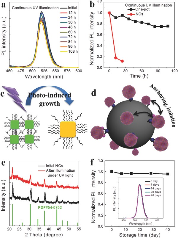 (a, b)持续紫外光照射下钙钛矿量子点的荧光强度随时间的变化关系