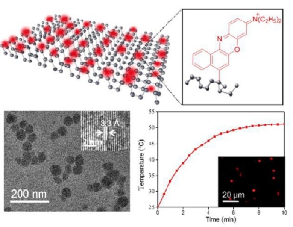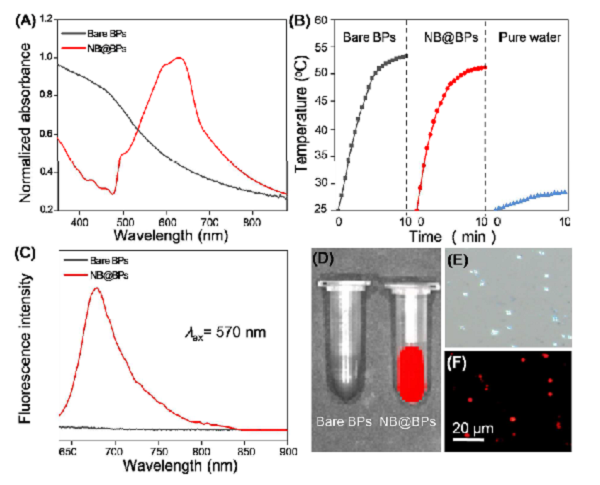 荧光分子Nile Blue修饰的黑磷示意图、微观结构,以及光热效果和荧光成像效果。
