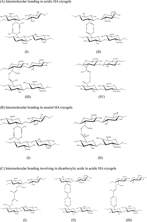 HA冷冻凝胶化过程是一个物理低温结构化过程。本研究表明,冷冻凝胶的物化性质受冷冻时长、冷冻-解冻循环次数、HA的分子量及加入的小分子(如二元羧酸和多元醇)的影响。冷冻时间长、冷冻-解冻循环次数多、HA分子量高、二元羧酸(如琥珀酸或戊二酸)的加入使冷冻凝胶的机械强度得到提高,而多元醇(如乙二醇、丁二醇或甘油)的加入则抑制了凝胶化过程的进行。物理交联的存在使冷冻凝胶具有一定的热稳定性、耐酸解和酶解能力,这些都是生物材料的重要性质。此外,本研究还发现:-COOH间的氢键作用提高了HA酸性冷冻凝胶网络分子间相互作用的稳定性,而-COO-与-NHCOCH3基团间的氢键作用则有效提高了中性冷冻凝胶网络的稳定性;然而,羟基对酸性和中性冷冻凝胶中的凝胶网络中的氢键形成均无显著贡献。