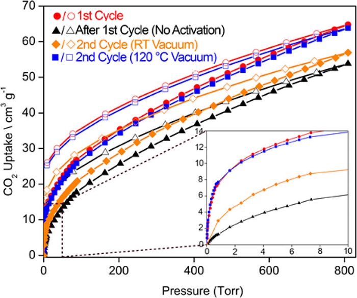 实心坐标点:吸附等温线,空心坐标点:脱附等温线;红色:活化的IRMOF-74-III-(CH2NH2)2第一次吸脱附循环等温线,黑色:未活化的IRMOF-74-III-(CH2NH2)2一次循环之后的吸脱附等温线,橙色:室温下活化12h后,IRMOF-74-III-(CH2NH2)2第二次吸脱附循环等温线,蓝色:120℃下活化2h后,IRMOF-74-III-(CH2NH2)2第二次吸脱附循环等温线;内置小图:低压下不同吸脱附等温线的放大图。