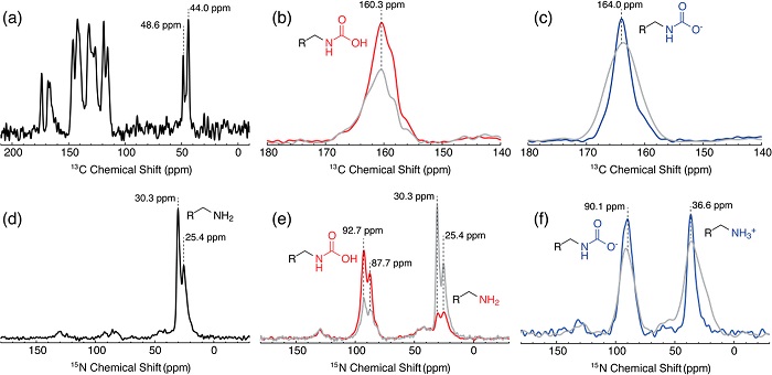 e. 暴露在675 Torr的CO2下24h(红色)和真空脱气24h(灰色)后的IRMOF-74-III-(CH2NH2)2 15N -CP-MAS NMR;
