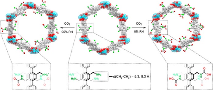 该工作介绍了一种新的双氨基MOF体系—IRMOF-74-III-(CH2NH2)2并阐明了在不同湿度条件下其与CO2相互作用的化学机制。