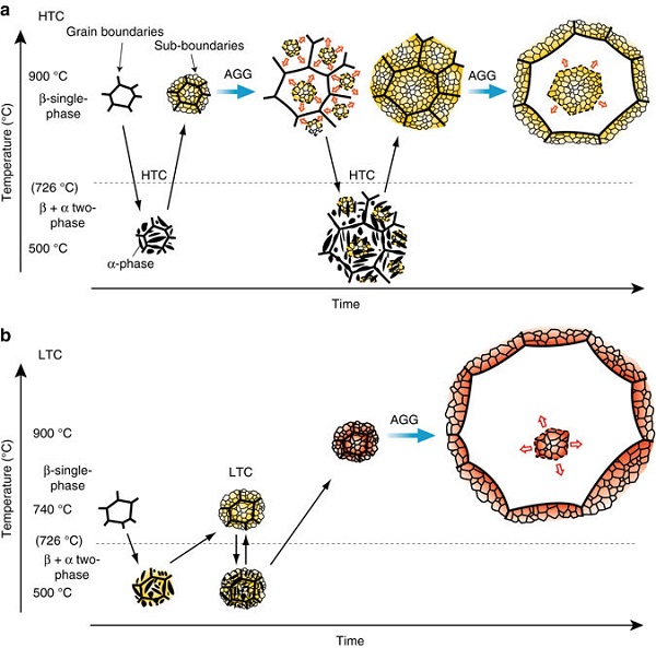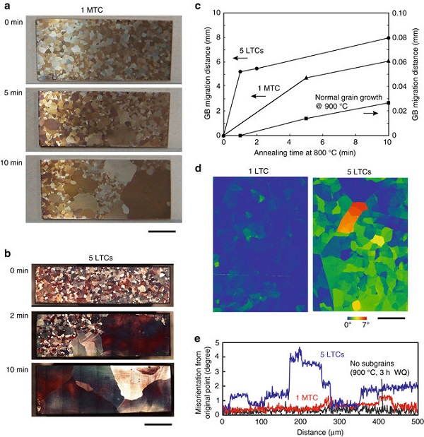 近日来,日本东北大学的Omori教授(通讯作者)研究团队在Nature Communications上发表题为“Ultra-large single crystals by abnormal grain growth”的文章。该文章指出,可以通过传统热处理工艺,诱导晶粒异常长大,进而实现铜-铝-锰合金单晶的大批量制备。其中,循环热处理提供了作为晶粒异常长大主要驱动力的亚晶界能;而进一步的循环低温热处理提高了亚晶界能,从而提高晶界迁移速率。通过这样的热处理,能够实现70厘米长单晶棒的制备。这一研究成果使其它具有相似结构的金属或陶瓷材料的单晶化成为可能。此外,由于目前单晶材料的主要应用之一是形状记忆合金,这种大批量制备单晶的方法也将大大扩展现有形状记忆合金的应用范围。